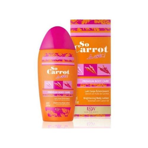 Fair & White So Carrot Brightening Body Lotion 500ml / 17.6 fl. oz Deliciously rich in precious Carrot Oil and delicately scented, this body lotion clarifies the skin day after day. For nourished, supple and luminous skin that radiates beauty. Directions: Apply to clean skin in the morning and at night, concentrating on dry areas of skin. Active ingredients: glycerin, brightening ingredient, carrot oil.